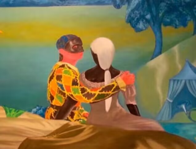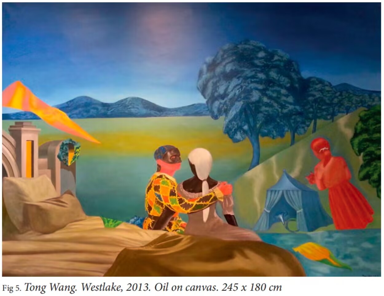 在当代中国艺术中,山水画依然占据着重要地位,成为一种连贯的艺术传统。著名当代艺术家王彤在其山水画中创造了强烈的表现形式,可以看出中国传统与西方艺术特征的融合。在他的作品《西湖》(2013)(图5)中,一位丑角与恋人同坐,他投以狡黠的目光望向观者,而恋人则凝视着满布青山与林木的景致,画面充盈着浓烈的深蓝色调。这也许并非真实的风景,而是想象生成的景观,却以当代的方式激发了人们对自然的敬意。通过细腻的色彩过渡,现实中的自然与想象中的自然之间形成了几乎不可察觉的转换,邀请人们成为其中的一部分。画面中独立呈现的一幕是一位身着红衣的女子站在蓝色帐篷前,帐中放置着法国号,这无疑是丑角恋人梦境的视觉化。由此,想象与梦境的世界被编织进现实的片段中,尤其是自然景观之中。