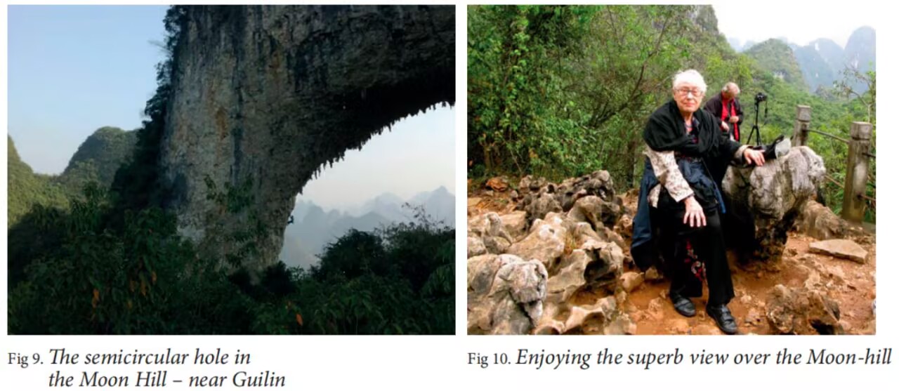这段美妙的旅程在桂林如画的风光中达到高潮。我们登上了附近的月亮山(因山体贯穿的巨大半圆形孔洞而得名)(图9)。能在此欣赏奇特喀斯特山峰的景致,部分山峰被薄雾遮掩,令人心旷神怡(图10)。